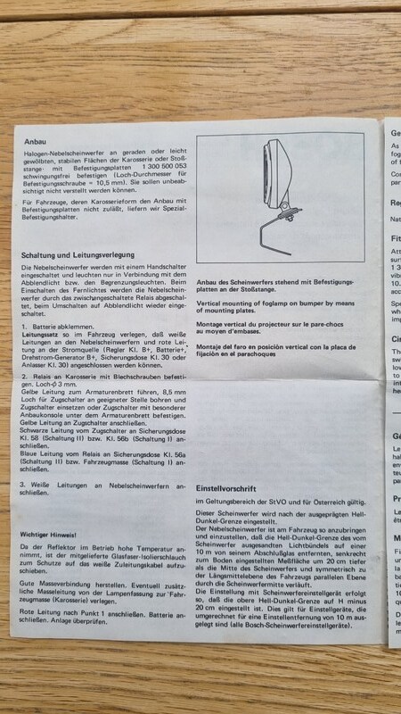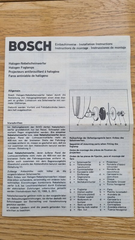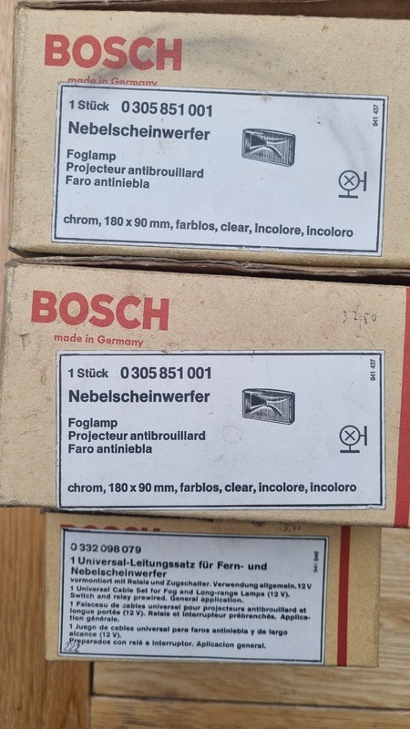 Zum Verkauf stehen zwei originale Bosch Nebelscheinwerfer, lt. Verpackung: 0 305 851 001, vermutlich passend für den VW Bulli T2 (Baujahr 1967–1979), vielleicht aber auch für andere Oldtimer.