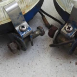 Gehäuse/Halter: Stärkere Gebrauchsspuren mit Rostansatz, grauen Punkten und blaue Farbreste an beiden Scheinwerfern unten am Gehäuse sowie an je einem Scheinwerfer feiner orangefarbener Farbsprühnebel seitlich bzw. eine Farbabplatzung zum oberen Gehäuserand hin mit ca. 6 x 3 cm vorhanden (siehe Fotos).