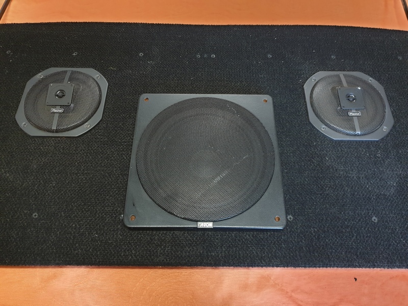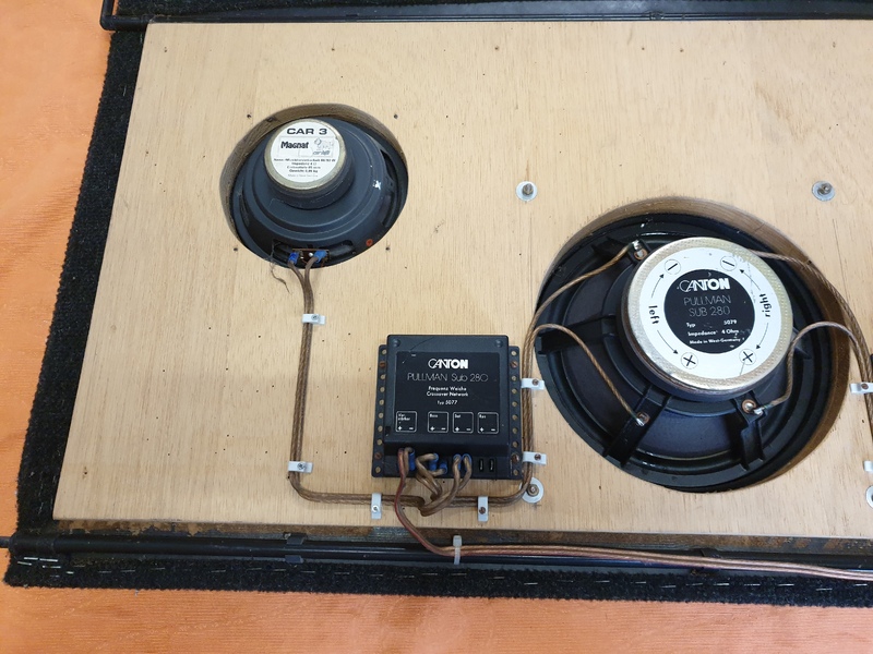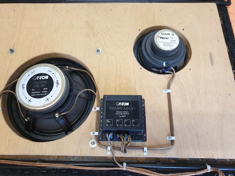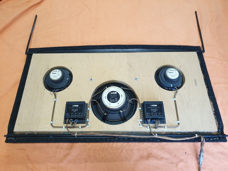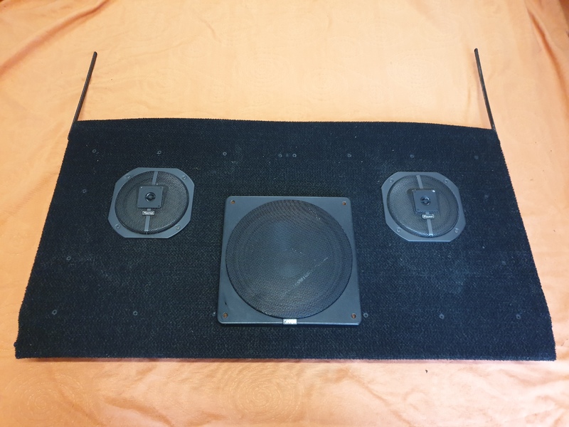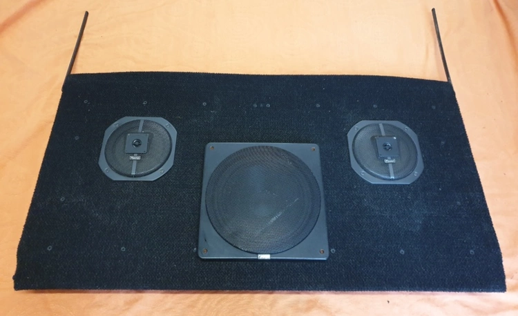 Verstärkte Hutablage des Scirocco I, mit 2 eingebauten Magnat CAR 3 Lautsprecher (Nenn/Musik 60/80W) und 1 eingebauten Canton Pullmann SUB 280, inklusive 2 Frequenzweichen Typ 5077.