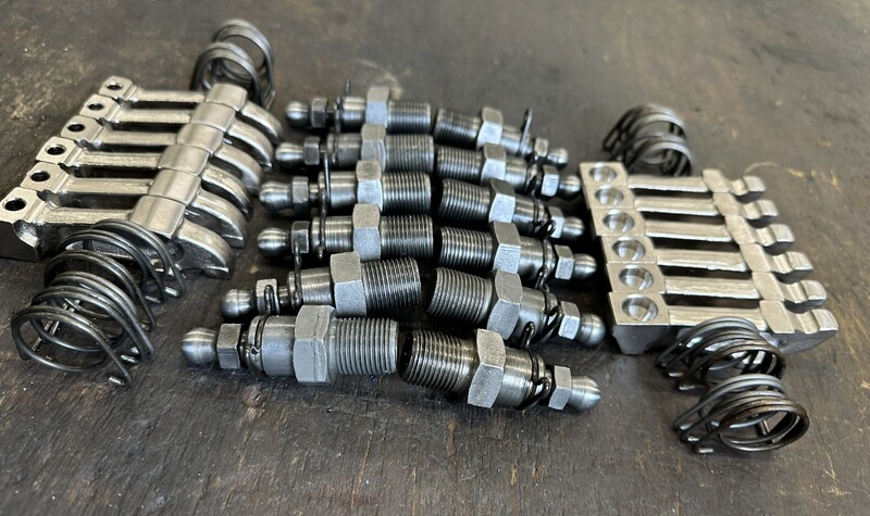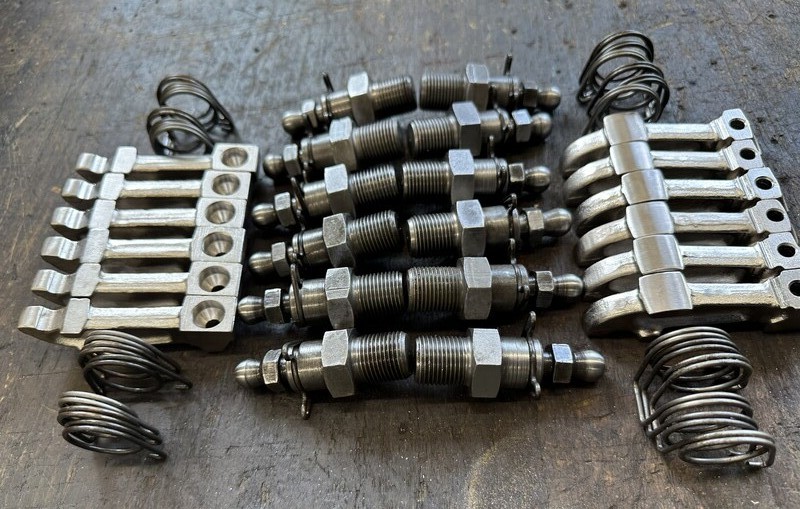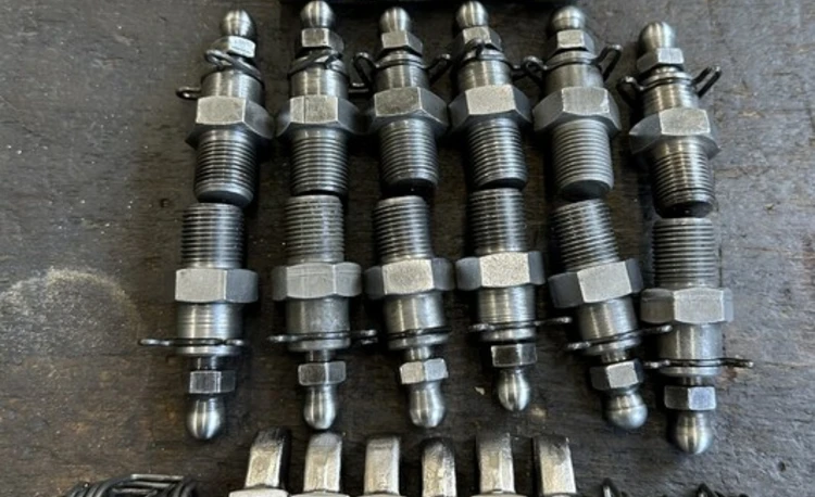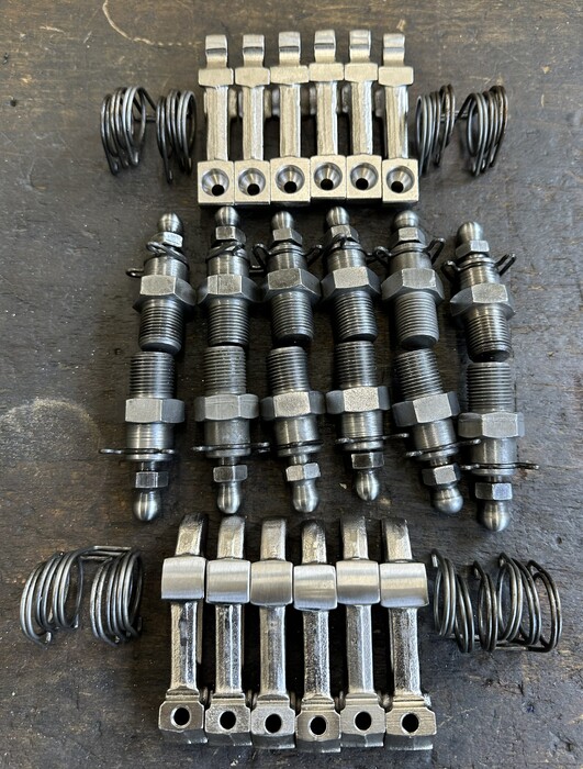Komplette gebrauchte Ventilsteuerung bestehend aus Kugelbolzen , Schwinghebel sowie den Federn für 6 Zylinder aus alten Lagerbestand. Gewindedrehmoment der Kugelbilzen geprüft , Kugeln ohne Einlaufkante sowie Verschleißspuren, Schwinghebel ohne Spuren an den Verschleißstellen. Die Teile befinden sich im neuwertigen , einbaufertigen Zustand.
