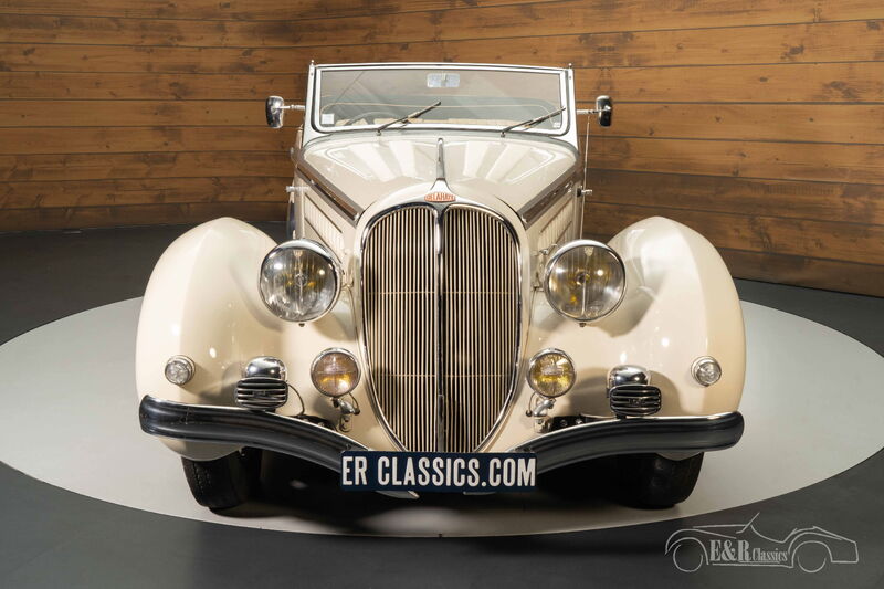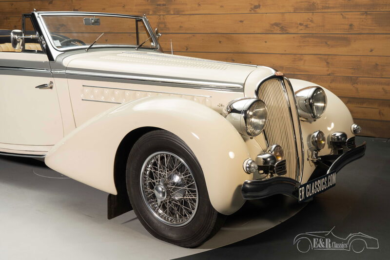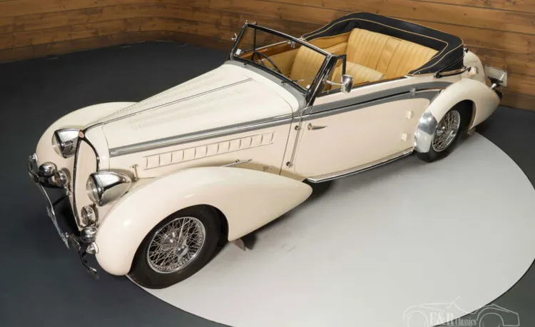 Delahaye 148L von Chapron | Nur 2 gebaut | Restauriert | 1939 Highlights: - Nur 2 Cabrioversionen gebaut - Gebaut vom Karosseriebauer Henri Chapron - Cabriolet im Mylord-Stil - 3.5-Liter-6-Zylinder-Motor Sehr seltener Delahaye 148L mit Henri Chapron-Karosserie zu verkaufen Wir bieten diesen schönen und sehr seltenen Delahaye 148L aus dem Jahr 1939 zum Verkauf an. Am 14. Februar 1939 wurde das Fahrgestell mit der Nummer 60819 an den legendären Karosseriebauer Henri Chapron geliefert. Dort wurde es mit einer Cabriolet-Karosserie im „Mylord-Stil“ ausgestattet, die von Chapron die Nummer 5975 erhielt. Die Arbeiten wurden Ende März desselben Jahres abgeschlossen und entsprachen den Grand-Luxe-Spezifikationen, einschließlich maßgeschneiderter Chromarbeiten und luxuriöser Innenausstattung. Heute ist das Chassis 60819 ein seltenes Beispiel für das typische Cabriolet-Karosseriedesign von Chapron, das anmutig geschwungene Pontonflügel mit kräftigen Linien in Kontrastfarbe kombiniert. Die Verwendung von Chromakzenten ist dezent und die schönen und ausgewogenen Proportionen, für die Henri Chapron berühmt war, sind ein Markenzeichen dieses großen Karosseriebauers aus Frankreichs goldenem Zeitalter. Der Klassiker wird von einem 3.5-Liter-6-Zylinder-Motor angetrieben, der mit einem 4-Gang-Schaltgetriebe gekoppelt ist. Der Delahaye wurde in der Vergangenheit restauriert und neu lackiert. Die cremefarbene Lackierung steht dem Klassiker hervorragend und bildet einen schönen Kontrast zur braunen Lederausstattung. Der Delahaye ist mit einem schwarzen Stoffverdeck ausgestattet. Einen Delahaye 148L von Chapron kaufen? Sie suchen einen Delahaye 148L von Chapron aus dem Jahr 1939? Dann hinterlassen Sie Ihre Daten über das Kontaktformular auf dieser Seite oder rufen Sie direkt unter +31 416 751 393 an. Unser Verkaufspersonal beantwortet gerne alle Ihre Fragen oder erstellt sogar ein persönliches Shop-Video für Sie. Wir bieten Unterstützung beim Transport. Wir liefern Ihnen Ihr Auto mit Tüv, H-Kennzeichen und Fahrzeugbrief, gegen Aufpreis. Sie zahlen keine Importsteuer mehr. Auch können Sie das Fahrzeug bei unsere Finanzierungspartner finanzieren.