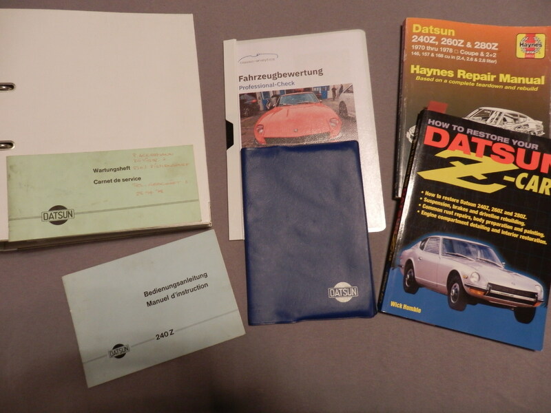 Original Datsun Bordbuch in Deutsch, div. Reparaturhandbücher, weitgehend alle Rechnungs- und TÜV-Belege der letzten Jahre sowie ein MiniLite Reserverad, Front- und Heckspoiler original Nismo (Nissan-Motorsport). Diverse Ersatzteile sind noch vorhanden bzw verhandelbar