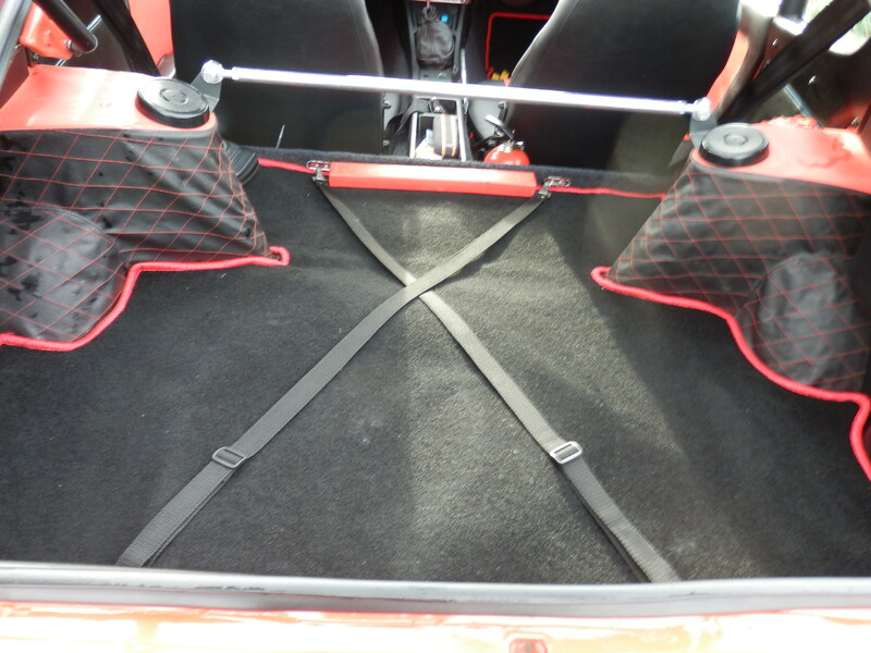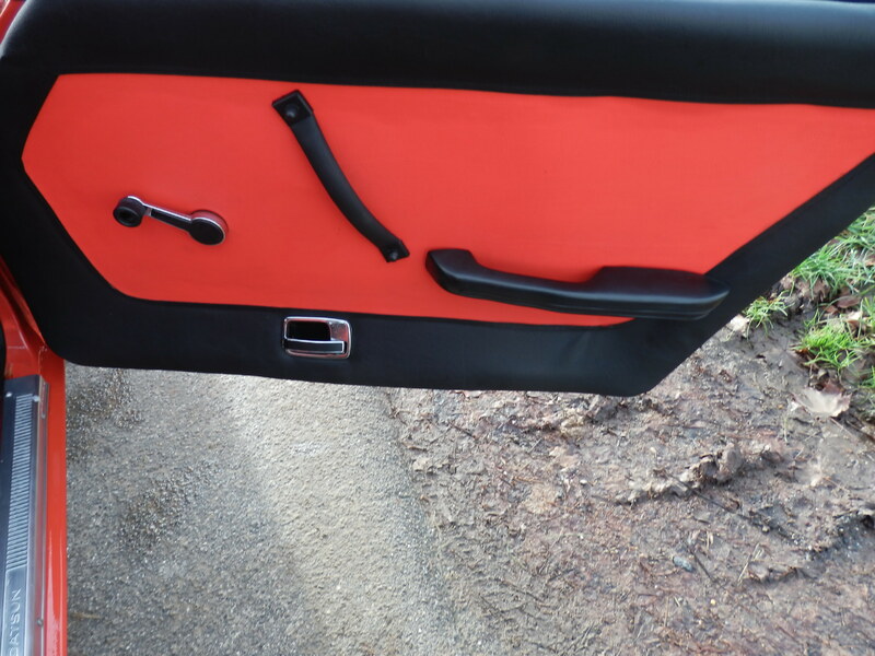 Sitze und Türverkleidungen in Kunstleder 2-farbig, Bodenteppich und Dachverkleidung neu bezogen, Dashboard-Cover, Fußmattensatz, 3-Punkt Automatik-Gurte nachgerüstet (keine Serie), Radio-Cassette 70er Jahre