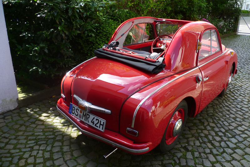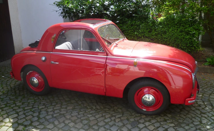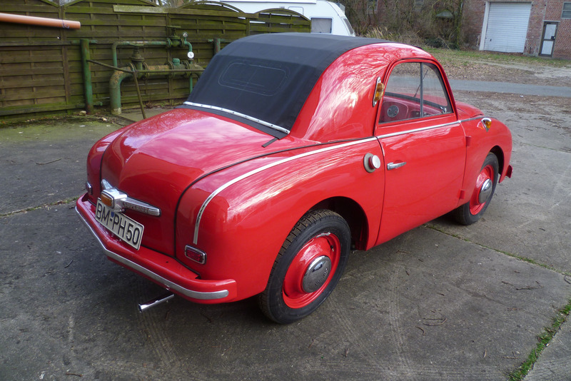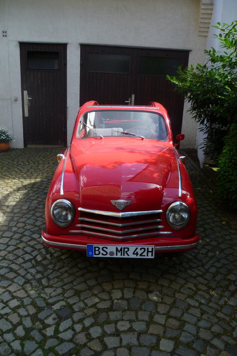 Zum Verkauf steht ein seltener Gutbrod Superior mit Schiebedach, Erstzulassung 1951, in einem strahlenden Rot.