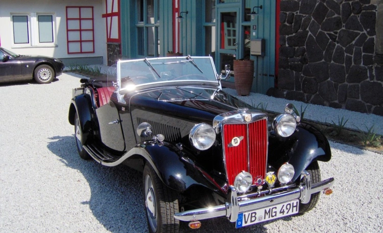 MG TD, EZ 13.12.1949, als Engländer natürlich Rechtslenker; aus Altersgründen trenne ich mich von meinem "kleinen Schwarzen", Innen rotes Leder, Fahrgestellnr. 0882, TÜV 8/27, 2007 aus 3. Hand erworben, Erst- und Zweitbesitzer aus Ohio, dann Verkauf nach GB, längere Hinterachsübersetzung des MGA, alloy valve cover, Querstabilisator, Kugelheizung, Verdeck, Persenning, Steckscheiben, 2 Gepäckträger, dazu noch einige Teile, Motor seit Revision 1.200 km gelaufen, der Wagen wurde kontinuierlich instandgehalten, ist in gutem Zustand und selbstversändlich sofort bereit für ein kerniges britisches Fahrgefühl, weitere Fotos auf Wunsch gerne per Mail, KP € 19.500,-, Tel. 0151/25769866 Großraum Frankfurt