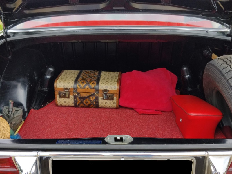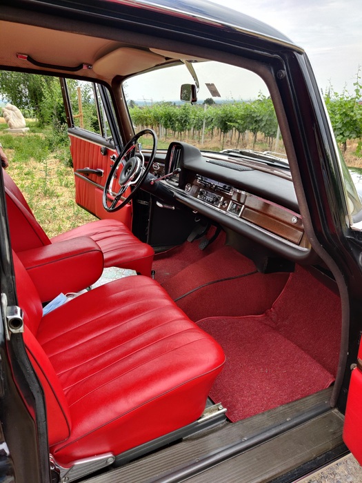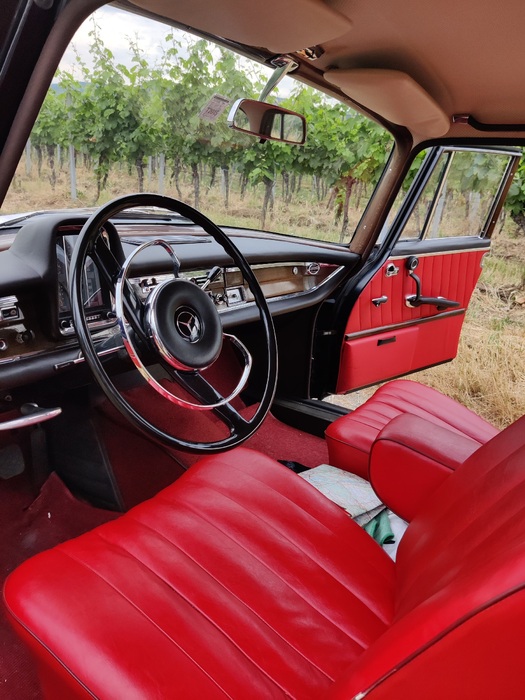 Dieser Mercedes Oldtimer präsentiert sich in eleganter schwarzer Lackierung, die seine klassischen Linien perfekt zur Geltung bringt. Das Innenleben ist mit edlem rotem Leder ausgestattet, das dem Fahrzeug einen Hauch von Luxus verleiht.