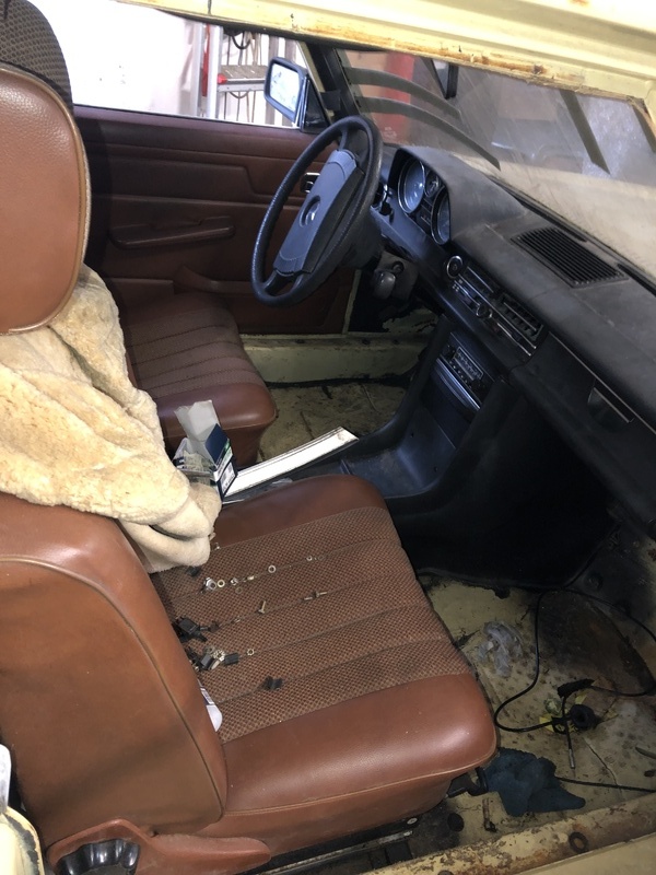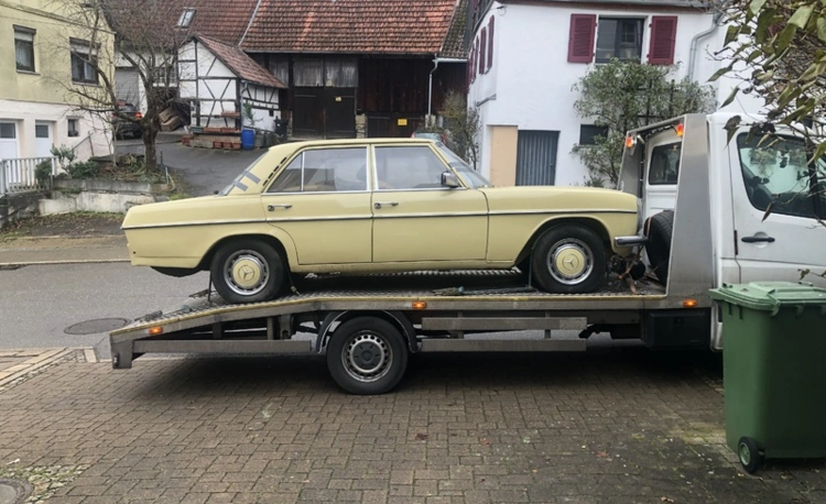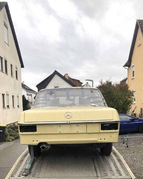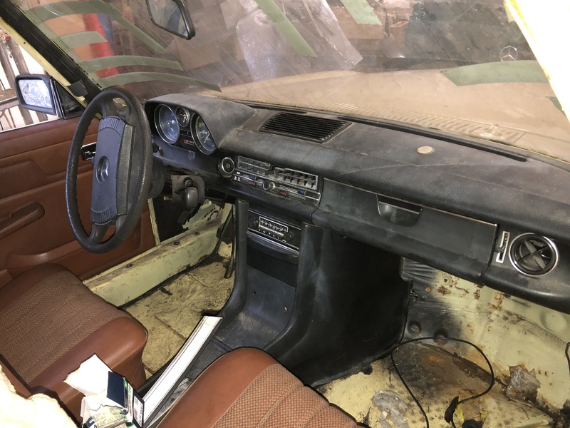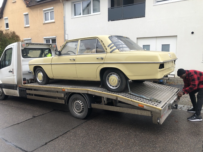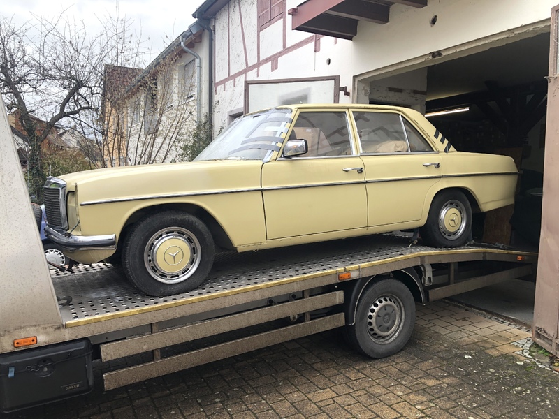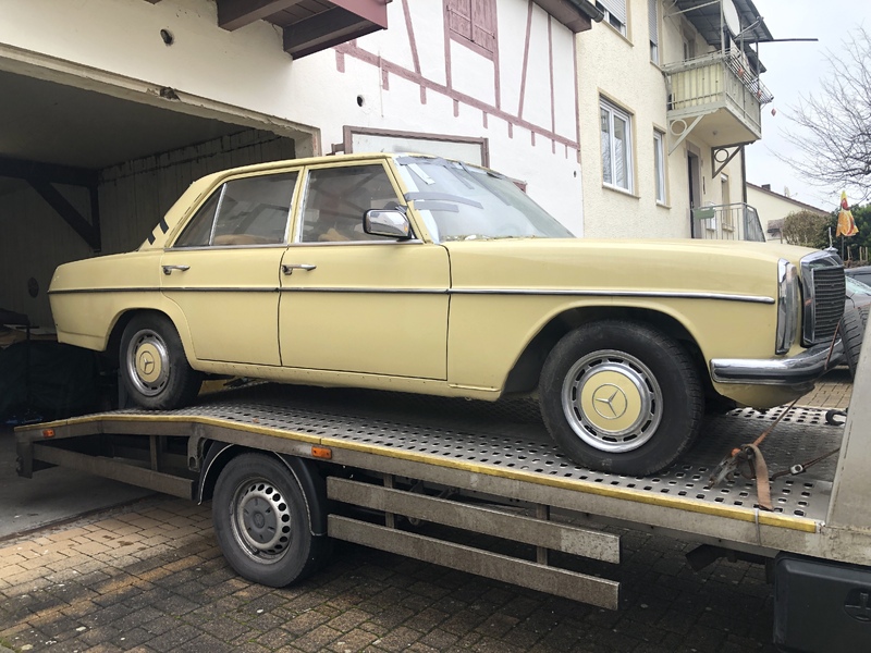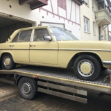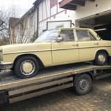 Mercedes Benz 234.4 W115 Serie 2. EZ 1908.1974, mit seltener Lenkradautomatik und dem bekannten 4-Zylinder mit 110 PS und 2277 ccm Hubraum. Der Motor läuft ziemlich gut. Weitere Extras: Servolenkung, Stahlschiebedach, Colorverglasung. Meine Auflistung beinhaltet keinen Anspruch auf Vollständigkeit! Der Wagen hat H-Kennzeichen. Der Tüv ist abgelaufen. Dürfte aber auf Grund der guten Karosserie und Zustand der Bremsanlage kein größeres Problem darstellen. Wagen steht trocken untergestellt. Laut Vorbesitzer sind gut 6000€ investiert worden. Es sind im Augenblick noch Restarbeiten notwendig wie Scheinwerfer und Rücklichter und hintere Stoßstange montieren. Teppiche im Innenraum verlegen und die Front-und Heckscheibe wieder einbauen. Wir machen, wenn wir die Zeit haben, so nach und nach Schrittweise weiter. Es ist die Unbedenklichkeitsbescheinigung Teil I und II vorhanden.