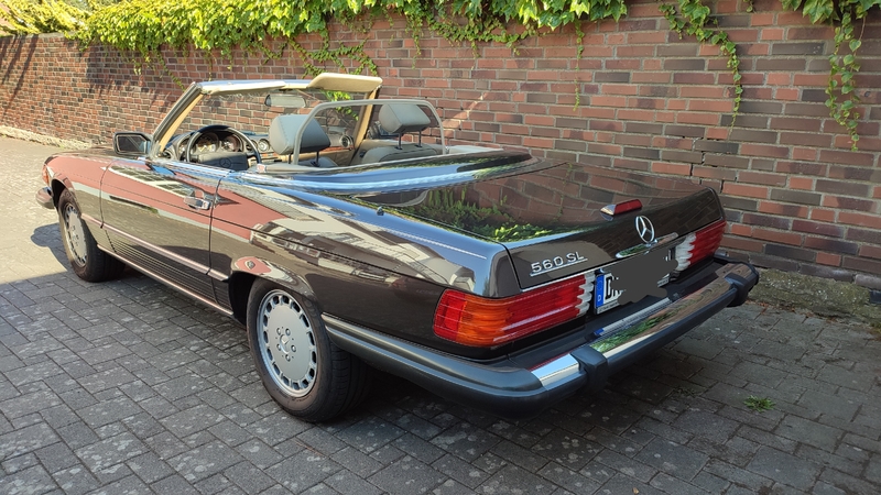 Aus der Sonne Kaliforniens zurück nach Deutschland. Unverbauter, absolut rostfreier, schöner 560 SL, unfallfrei, alles original, ABS, Alu, EFH, El. SP, Gawa, neuer Edelstahl-Auspuff m. Kat., neue Lenkung, neue Dichtungen, Hardtop mit Rollwagen, original beige Lederausstattung, Bison-Braun Metallic, RC Becker Mexico mit aut. Antenne, ZV, mit Gutachten (42.000 €), Ostersonderpreis: 35.900€ VB, Standort 52525 Heinsberg