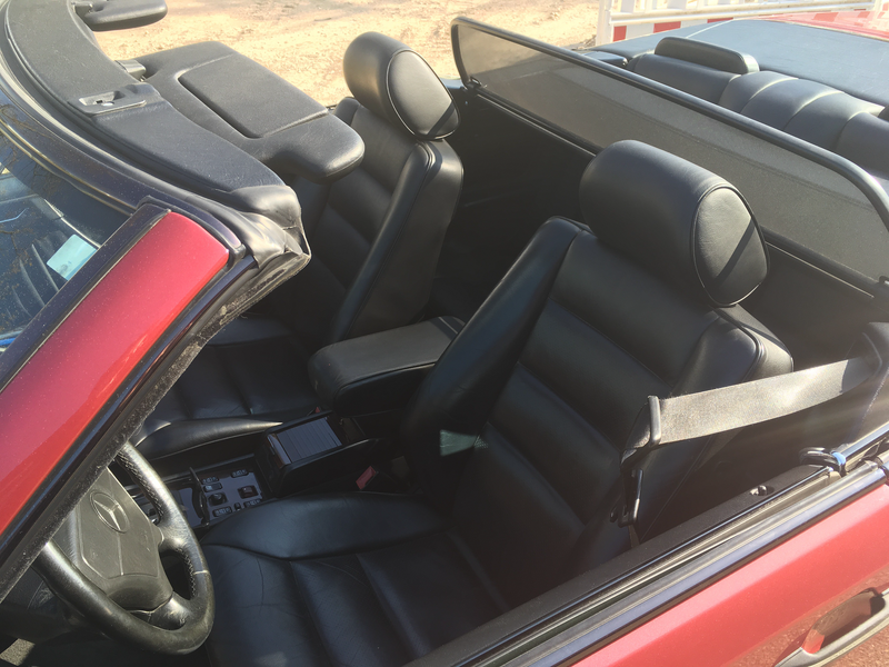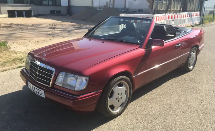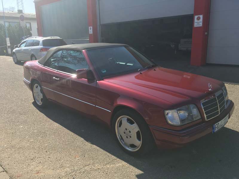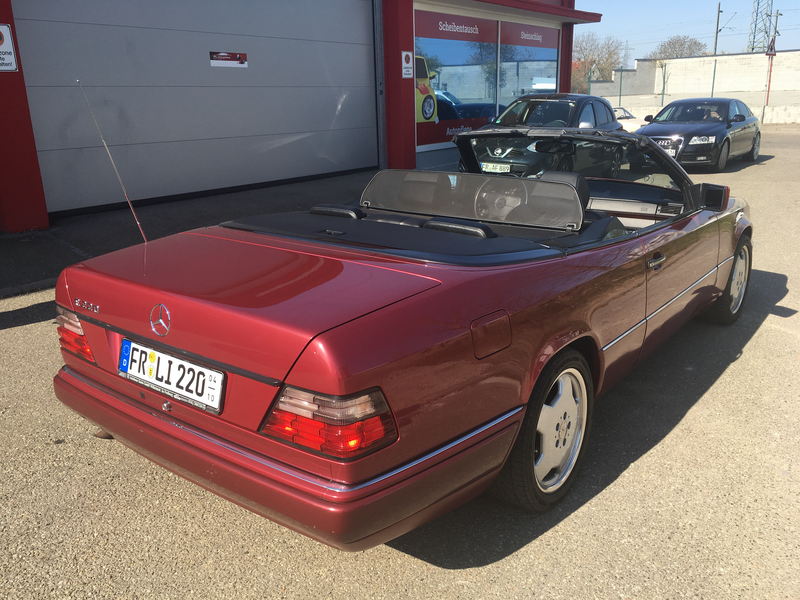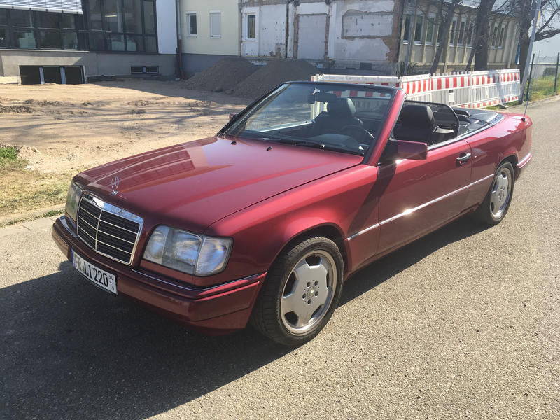 Sammlerfahrzeug: 1995 Mercedes-Benz E220 Cabriolet A124 mit original 112000 km. 512 Almadinerot metallic mit 261 Leder schwarz. Mit Sportline ab-Werk. 17-Zoll AMG-Felgen mit 225/45 R17 Reifen im Sommer, 15-Zoll Alufelgen mit Winterreifen.