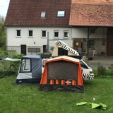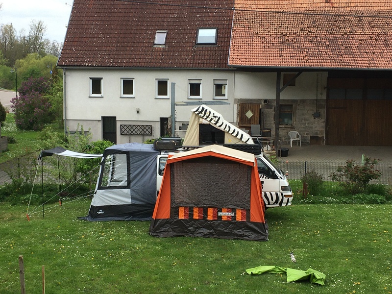 Eventuell mit angeboten: Ein Satz Karosserie-Reparaturbleche (vorsorglich beschafft, so lange es noch welche gibt. Keine Durchrostungen am Fahrzeug!) Radlauf vorne außen und innen, Einstigsmulden, Schweller, Radlauf hinten. Habe die Teile chemisch entlacken und galvanisch verzinken lassen, Selbstkosten knapp 1.000.- €. Das abgebildete zeitgenössische Vorzelt von Gottschalk.