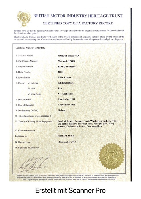 Biete hier einen einzigartigen Mini. Es ist wohl einer der ersten gebauten Mini Kombis in Oxford. Das Baujahr ist exakt der 1.11.1961 (Geburtsurkunde vorhanden. Auslieferung nach Finland als Lkw 7.11.1961 (Günstigerer Einfuhrzoll als Lkw) . Dort Übernahme durch den Erstbesitzer und Einsetzen der Seitenscheiben sowie Installation der hinteren Sitzbank. Damit war der Wagen ein Pkw. Betrieb in Finland bis zum 93. Lj. des Erstbesitzers. Zahlreiche Publikationen in finnischen Automobilzeitschriften (vorhanden und übersetzt) Dann Überstellung nach Deutschland. Das Auto ist immer noch im Erstbesitz. Kein weiterer Halter. Keine Restauration. Absoluter Originalzustand. Nie lackiert. Innen wie 1961, ohne große Abnutzungsspuren. Keine Schweißarbeiten oder sonst. erforderlich. Sofort einsatzbereit. Motor revidiert (Alterungsschäden). Alle Altteile vorhanden. Der Zustand im Gutachten von 2017 bezieht sich auf den Originalzustand und der ist gebraucht. Ich möchte das Auto in Hände abgeben, die diesen Zustand zu würdigen wissen und keine Aufhübschung planen.