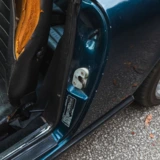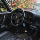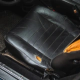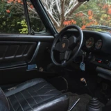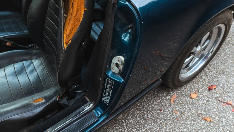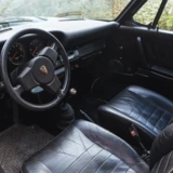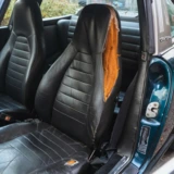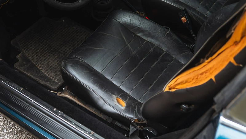 The interior features original black leather with age-related wear: damaged driver’s seat, cracked rear dashboard, and general patina throughout. The Targa roof was recovered in 2020. Most switches are reported to work, although the dashboard lights remain permanently illuminated. An air-conditioning system is present but currently removed.