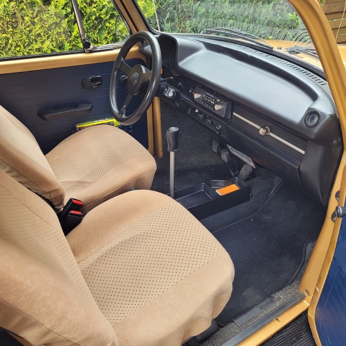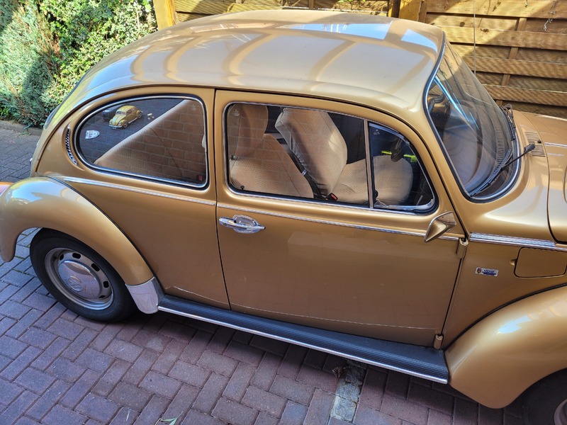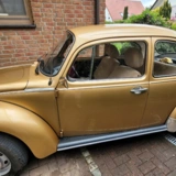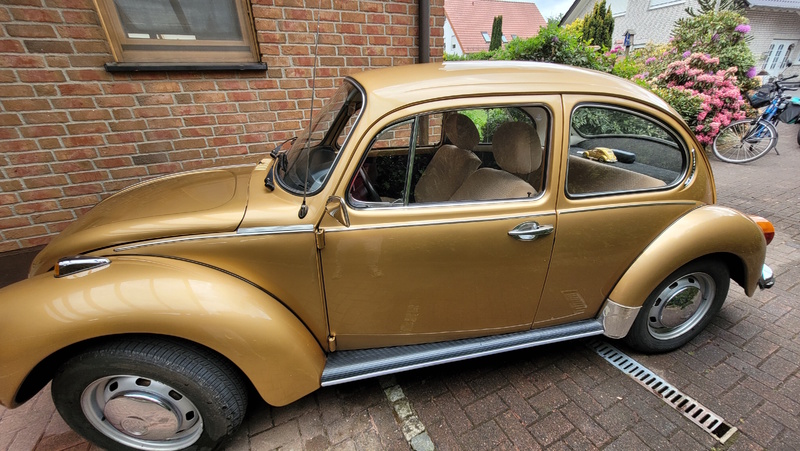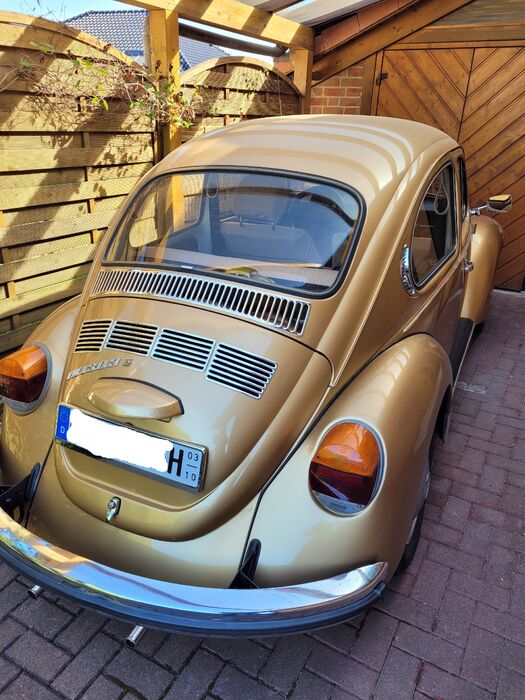 Von privat: VW Käfer 1303 mit H-Kennzeichen. Das Fahrzeug wurde vom Vorbesitzer restauriert und dabei auch von weiß auf goldmetallic umlackiert. Das Fahrzeug ist unfallfrei. Das Fahrzeug befindet sich seit 2018 in unserem Besitz und hat seitdem ca. 14.000 Kilometer (nur im Sommer) gelaufen. Zurzeit wird der Garagenwagen weniger als 1.000 Kilometer im Jahr bewegt. Es liegt ein Wertgutachten aus 2018 mit der Zustandsnote 2- vor. Minimale Lackmängel. Das Fahrzeug hat ein Leder-Sportlenkrad und einen zweiten Außenspiegel. (Das Originallenkred ist aber ebenfalls vorhanden).