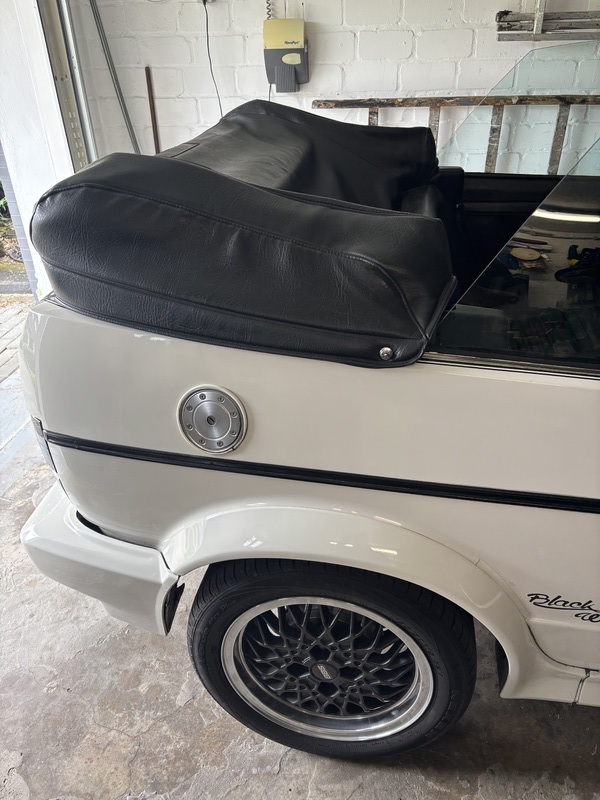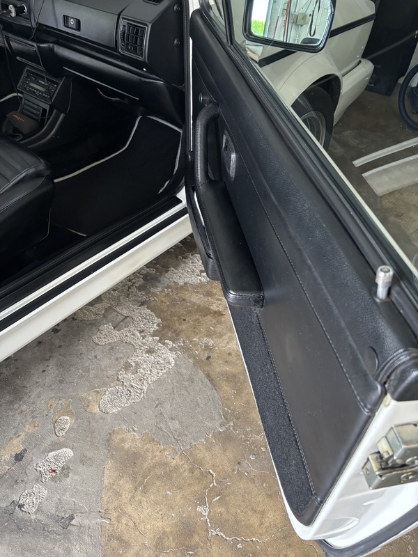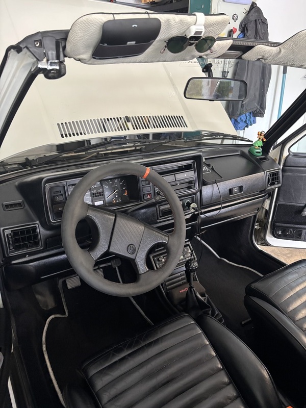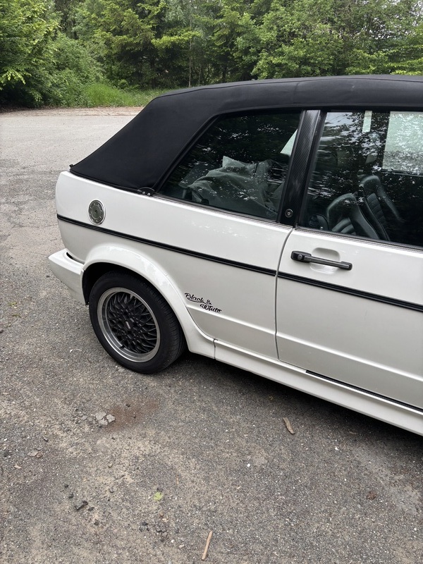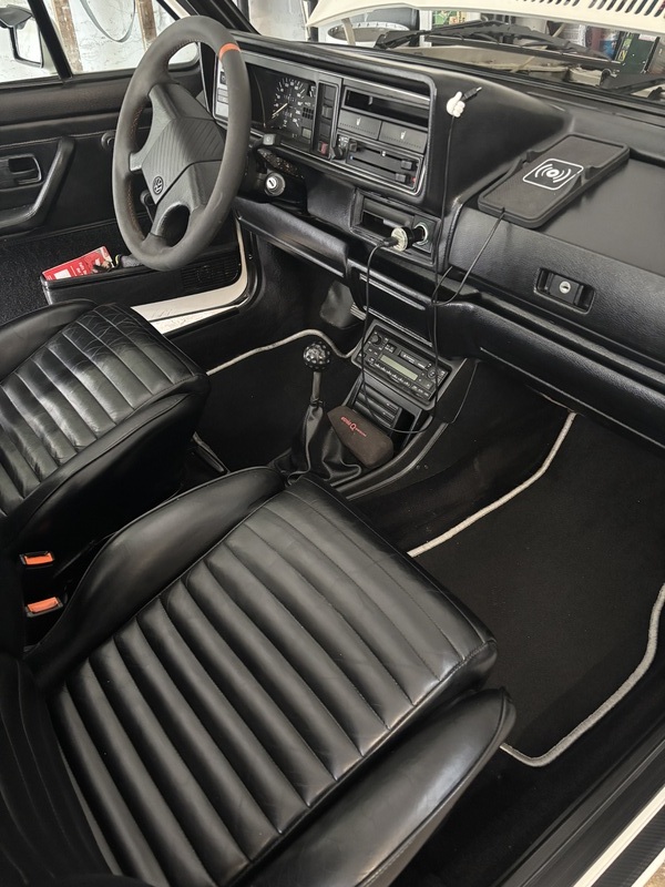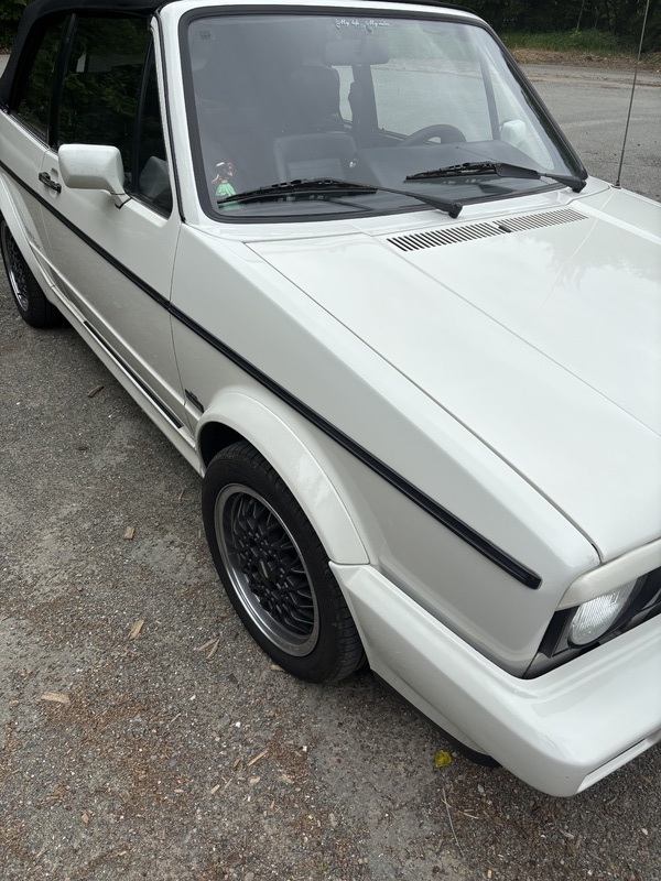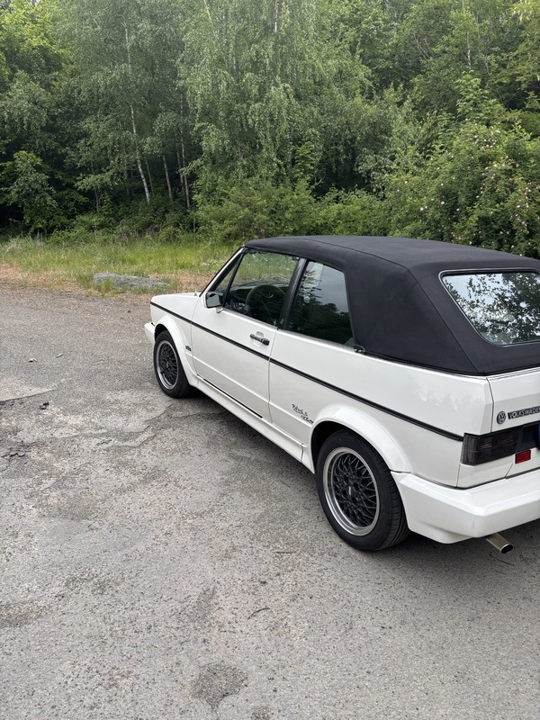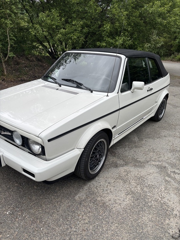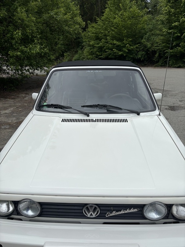 Ich habe es vor gut 7 Jahren beim einem Oldtimer Händler entdeckt (aus erster Frauen Hand und deren Familie) und es hat in seinen gut 37 Jahren keinen Winter gesehen , danach ist auch der sehr gute Zustand zu beurteilen . Ich habe doch sehr viel investiert an Geld , Zeit und Arbeit die letzten Jahre wie z.B. ein neues Stoffverdeck mit allem Zip und Zap samt Heckscheibenrahmen ( 2500€), eine doch seltene Golf 1 Lederausstattung nachgerüstet ( 1200€ ) , Vergaser komplett revidiert und eingestellt bei Bosch , neue Stoßdämper hinten , vorn neue Bremsen , neuer Krümmer , neue Batterie , Sportline Radsatz BBS RA375 mit Radsicherung , Zahnriemen / Wasserpumpe komplett , neuer Endtopf und und und … von der allgemeinen Pflege mal ganz abgesehen .