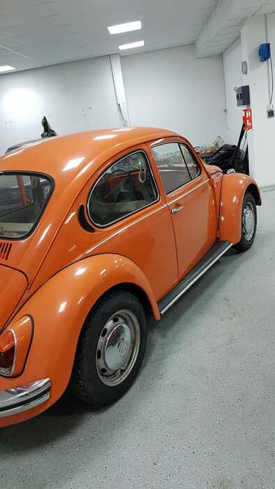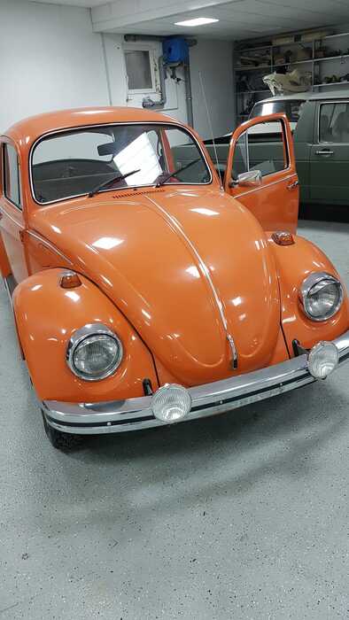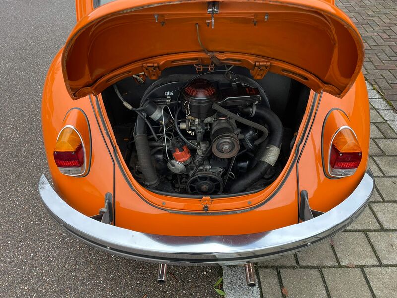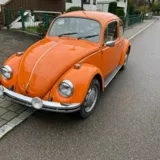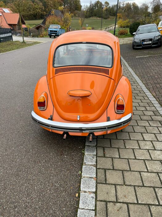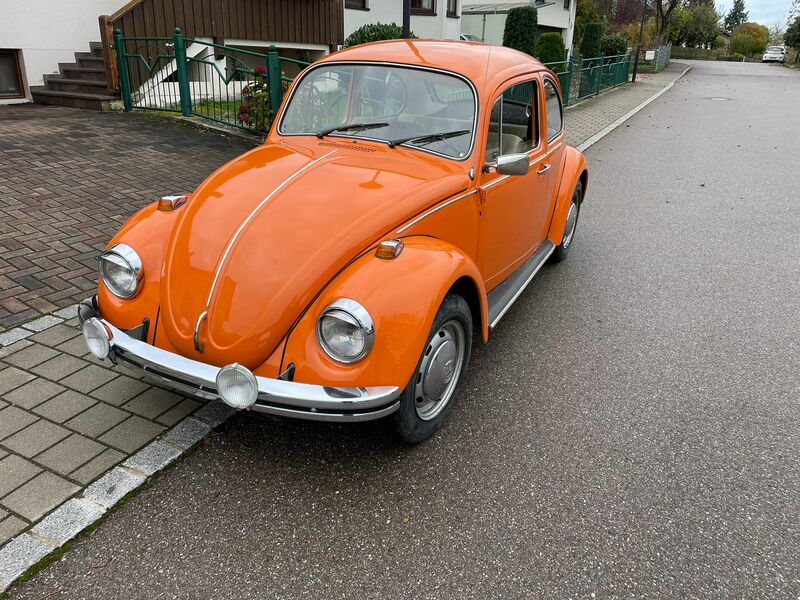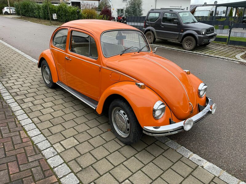 Ein VW Käfer 1200, Baujahr 1973, Erstzulassung 06/73, in der seltenen Farbe Orange – so leuchtend, dass selbst der Sonnenuntergang neidisch wird.