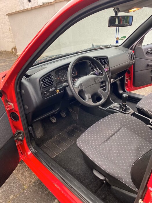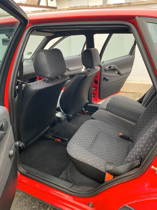 Aufgrund des Alters und der roten Farbe ist der Lack stellenweise durch UV-Einstrahlung leicht ausgeblichen, typisch bei roten Fahrzeugen dieser Generation.