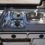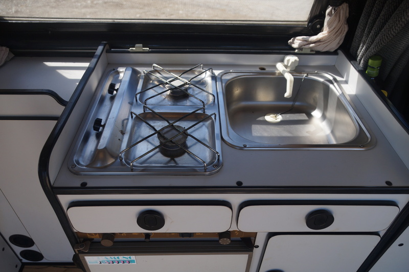 * Küchenzeile inkl. Spüle, Gaskochfelder, Elektrolux-Kühlschrank; Abdeckung der Küchenzeile zu Tisch umbaubar
