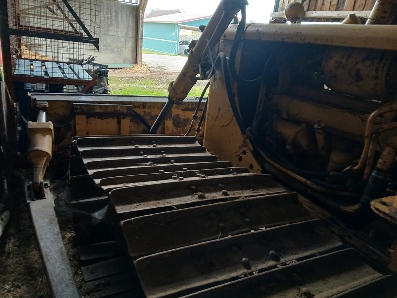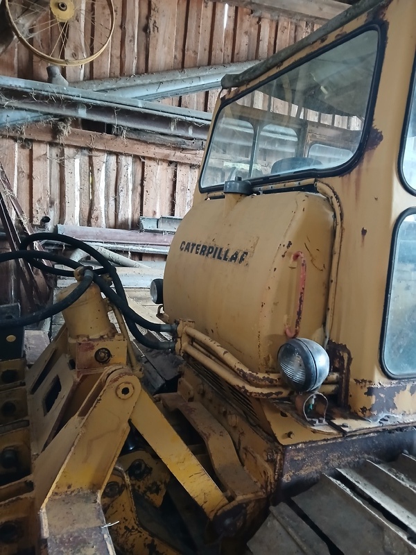 Caterpillar D5 Schubraupe mit Moorlaufwerk (breite Ketten) und 5-Zinken Heckaufreißer. Das Schild ist hydraulisch neigbar. Die Kabine verfügt über eine Heizung.
