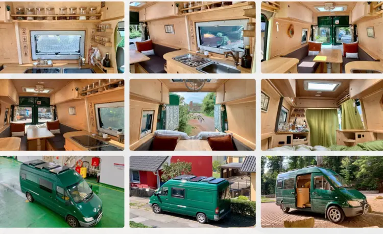 professionell ausgebaut, Innenausbau aus hochwertigem Massivholz, Dämmung mit Kork, Hanf, Wolle, 106 l Frischwassertank, Bordbatterie, Solarpanele, komplett unabhängig, unverwüstlicher Mercedes-Turbo-Diesel mit Steuerkette, vom Vorbesitzer in Originalfarbe neu lackiert, Schadstoffklasse Euro 4, Anzahl Sitz- und Schlafplätze 2, Länge 5785 mm, Breite 1933 mm, Höhe 2570 mm, Anhängekupplung, Alufelgen, Frontspoiler, Schiebetür rechts, Dachfenster 2x Dometic Midi Heki, Seitenfenster 2x Dometic S4 Black Line, 4 Türen, Doppelbett 170x190 cm, Drehkonsole Beifahrersitz, Ventilator Caframo Sirocco II Elite, Komposttoilette Kidwich Mini Loo, Kühlschrank Dometic Cool Matic CRX 80Lite, Standheizung Autterm Air Planar 2D Diesel, Tischgestell Ilse Technik Liftgestell stufenlos und drehbar, 59 und 54 Liter Wassertanks unter dem Wagen, 450 Wp Solarpanele Tiger Exped Black Tiger (parallel), Außendusche, Fenstersicherung, Riegelschloss, registriert als offizielles Wohmobil