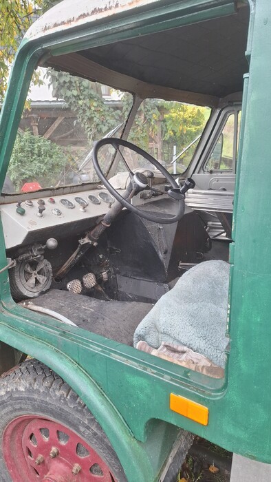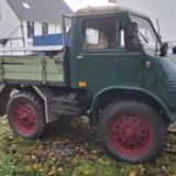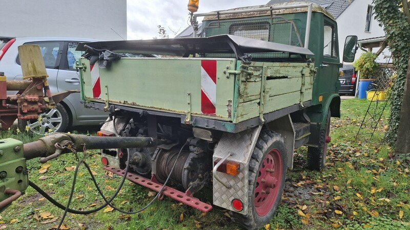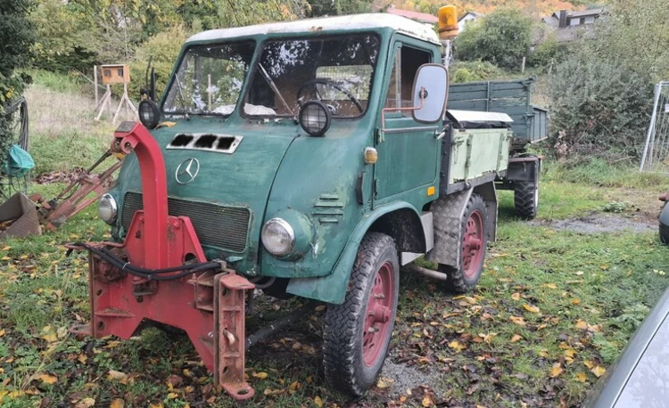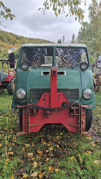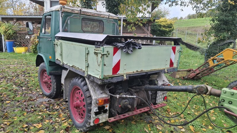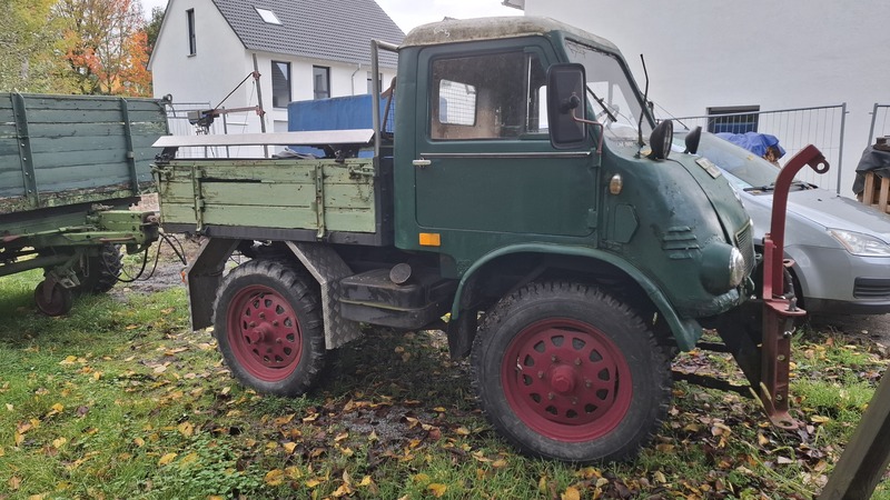 Daimler Benz Unimog 401 mit Westfalia-Kabine BJ.1956. Wegen Aufgabe der Hobbylandwirtschaft seit kurzem nicht mehr im Einsatz. TÜV Oktober 2025 gerade abgelaufen. Fahrtüchtig mit optischen Mängeln, unrestauriert. Seilwinde hinten, Hydraulikanschluss hinten, Druckluftanschluss vorne für Schneeschild mit Zylinder (Schneeschild nicht mehr vorhanden) Schneeketten hinten.