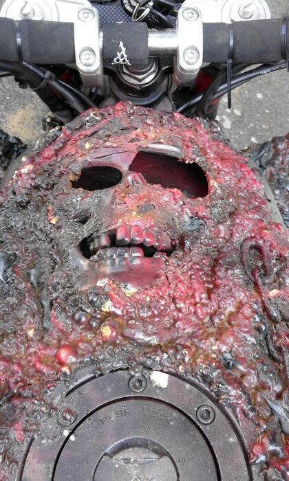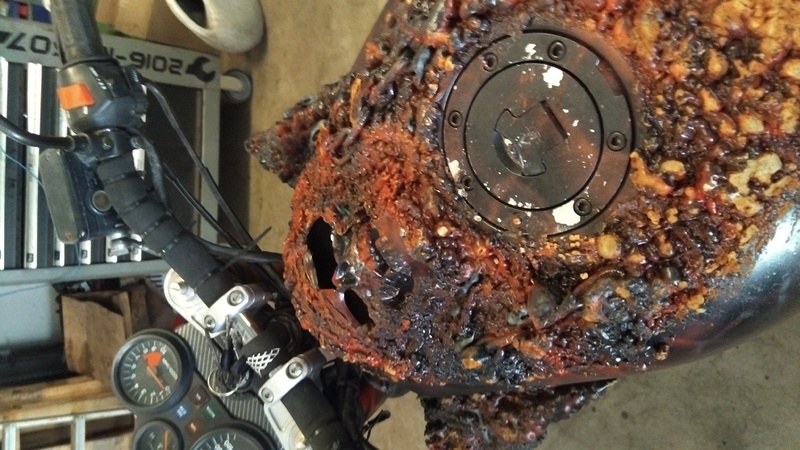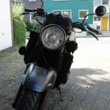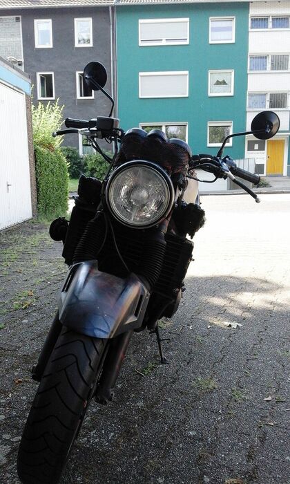 Das Design ist auf Endzeit gestylt, es funktioniert alles wie es soll. Stahlflexleitung eingetragen, vor Tüv neue Kerzen und Batterie eingebaut.