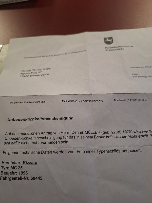 Die Mofa ist Fahrbereit und Verkehrssicher Sie hat etwas Rost und ein Paar gebrauchsspuren Die Mofa Hat ein Kiekstarter Springt beim ersten Tritt an.Sie hat keine Papiere aber Eine Unbedenklichkeitsbescheinigung von Der Polizei  dieses ist ein Privat Verkauf