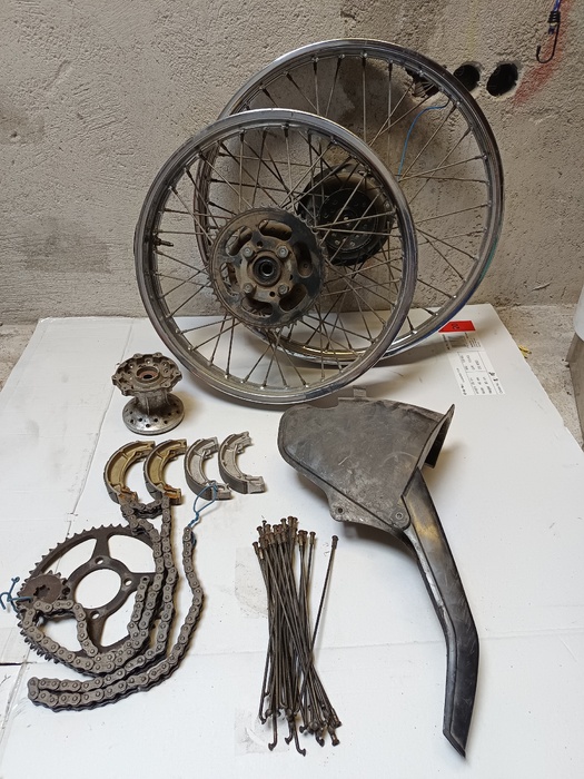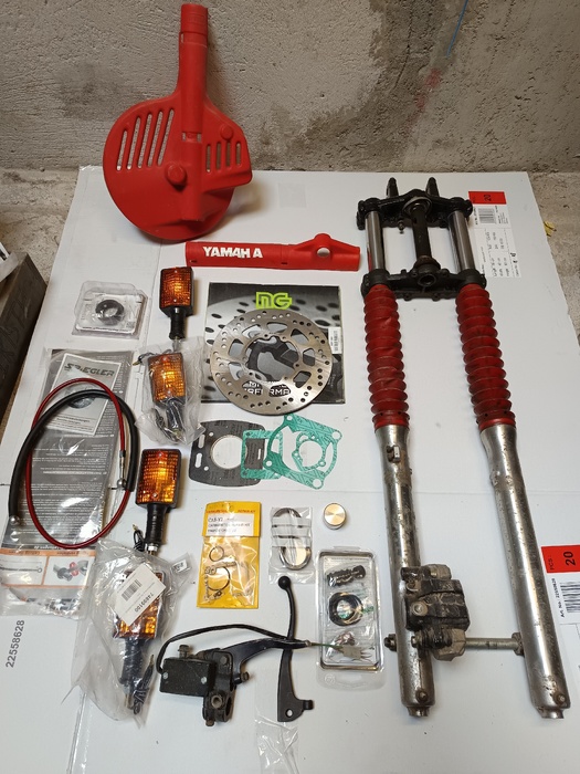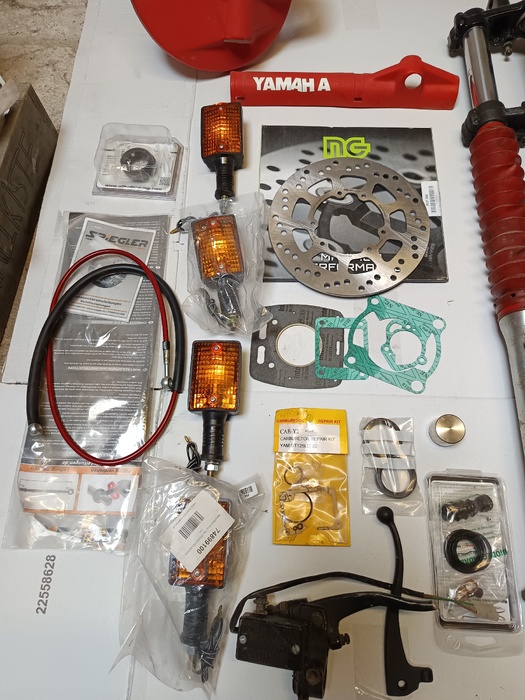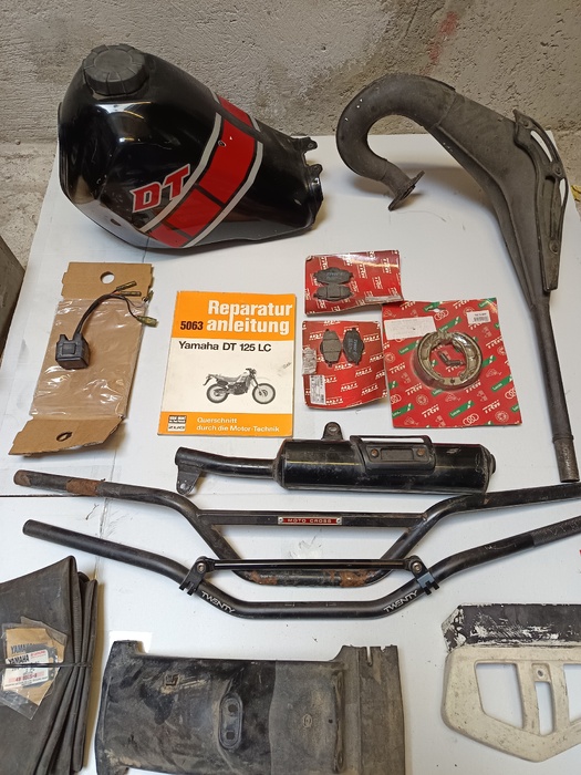 War schon mal mit 12 PS fuer 16 jährige zugelassen,aktuell 17 PS eingetragen,viele Bauteile dabei: LC 2 Gabel+neue Gabel -Simmerringe auch für LC 1 Gabel,neue Bremsscheibe,Ueberholsatz Vergaser und Bremszange,LC 2 Tank,neuer Bremsschlauch Stahlummantelt mit ABE,Sitzbank+ Felgen ,neue Blinker,Acervis Bremsscheibenschutz original aus den 80er Jahren, Batterie und Getr.Oel neu ,Werkstatt Handbuch,Felgen vorne und hinten,und vieles vieles mehr.