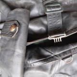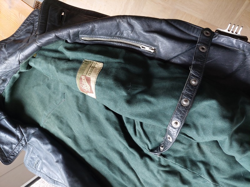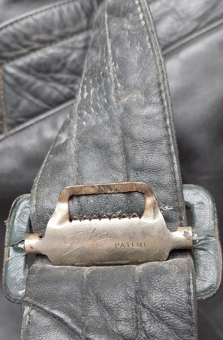 Die Metall-Schließe ist ein wichtiger Datierungshinweis. Die Gravur „Gutos Patent“ ist im typischen Schreibschrift-Logo ausgeführt, wie sie die Firma GUTOS Metallwarenfabrik, Pforzheim ab ca. späten 1940er Jahren bis 1970er Jahren verwendete. Der Mechanismus mit gezahntem Haltebügel ist ein patentiertes System, das z. B. bei Motorradjacken, Fliegerjacken und Arbeitsmänteln eingesetzt wurde.