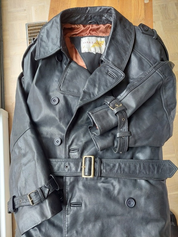 Schwerer, originaler Ledermantel der Marke Striwa – Original Fabrikat (Lichtenfels, Bayern).