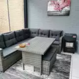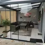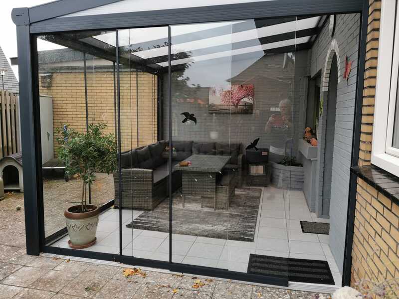 Der Wintergarten (siehe Foto rechts) ist ausgestattet mit einer Schiebeanlage aus Glas und Isolierverglasung.